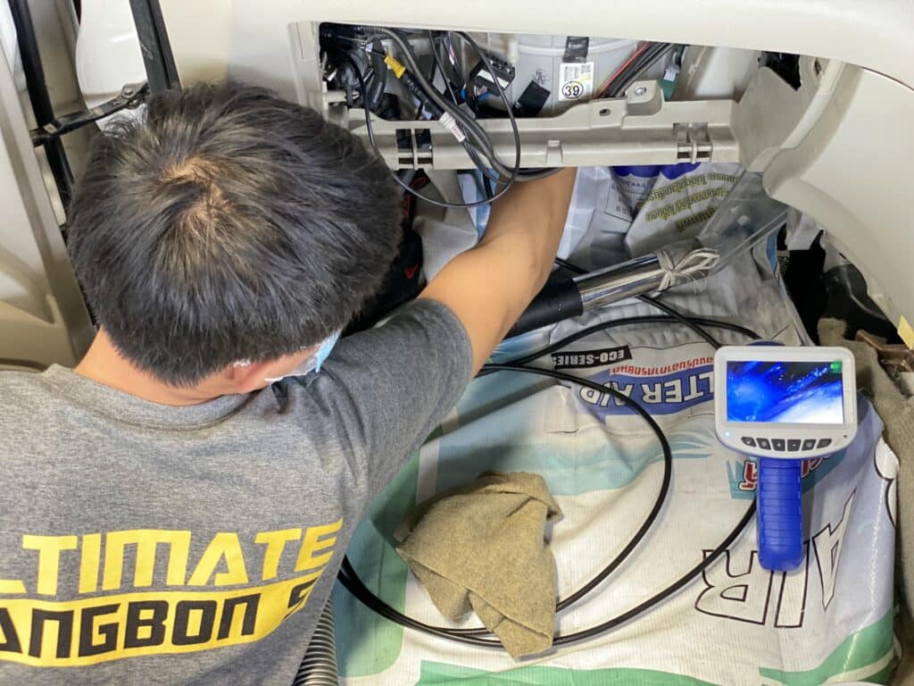 ก่อนทำการล้าง ช่างจะใช้กล้องส่องเข้าไปภายในตู้แอร์ ทำให้สามารถเห็นสภาพความสกปรกจริงภายใน